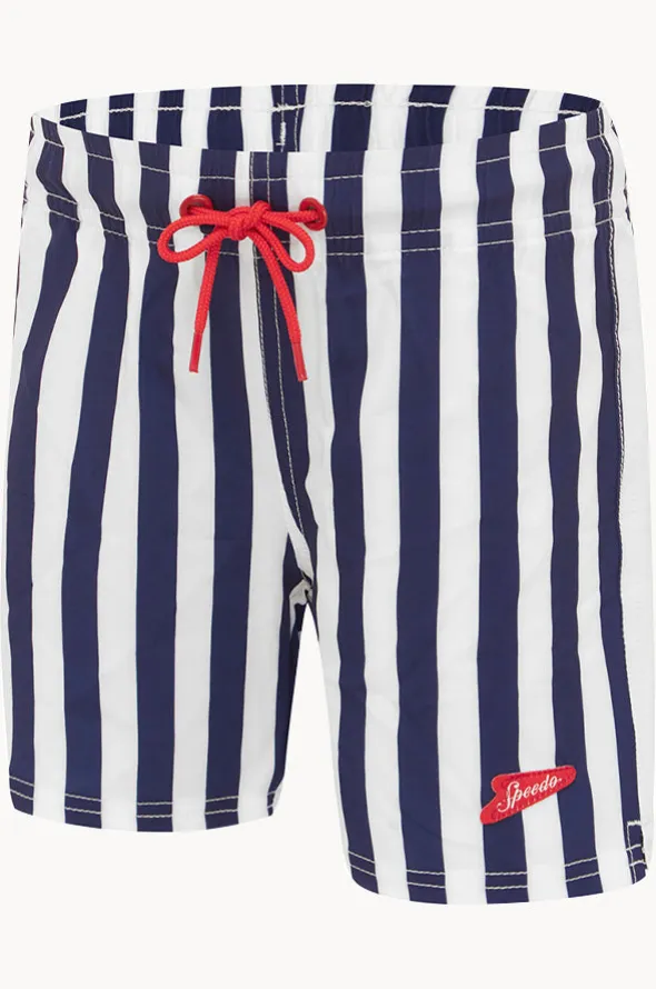 Speedo Boys Stripe Shorties Boardshort in Navy/White features an elasticated waistband, drawcord to secure, 4-way stretch, and is available in sizes 3-6.