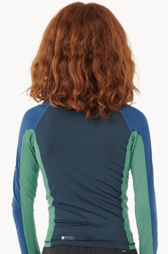 Rip Curl Boys Tropic Daze Long Sleeve Suntop in Dark Navy offers a front zip, long sleeves, contrasting panels, UPF 50+ sun protection, available in sizes 8-14.