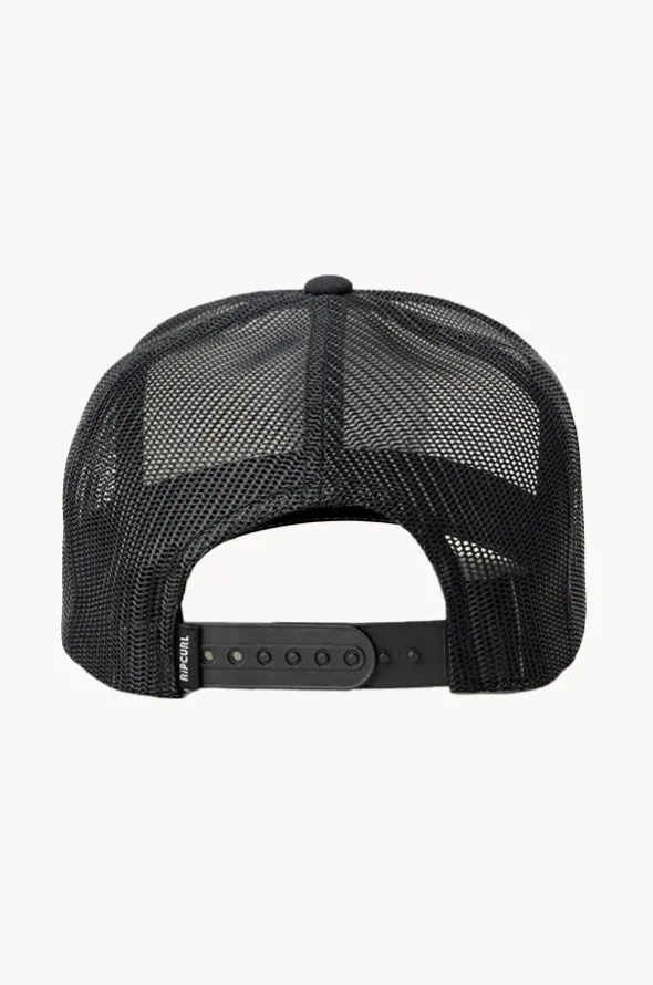 Rip Curl Boys Wetsuit Icon Trucker Cap in Black/White features a curved peak, adjustable back, mesh panels, woven Rip Curl badge, and is available in O/S.