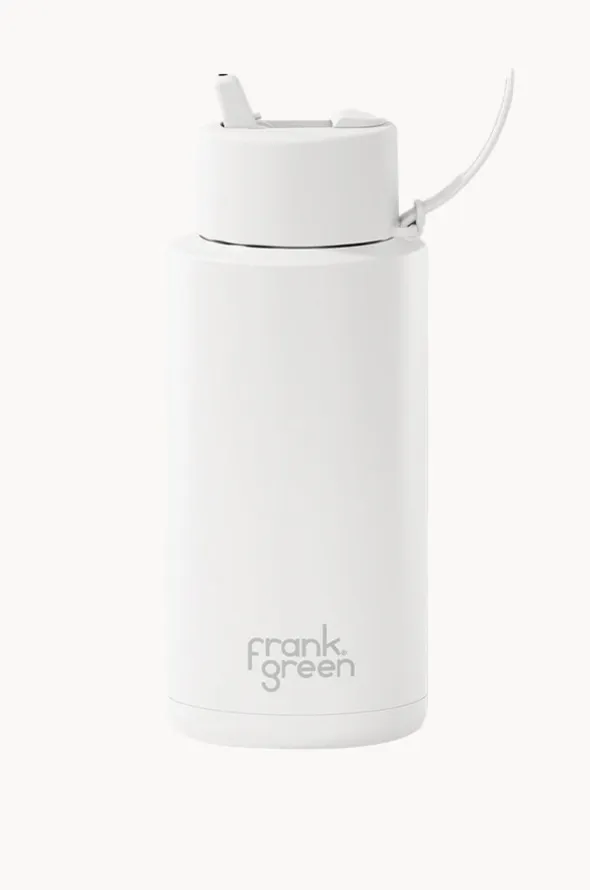 Frank Green Ceramic Drink Bottle 1L in Cloud offers a straw lid, carry handle, triple wall vacuum insulated design, and is available in a 1L capacity.