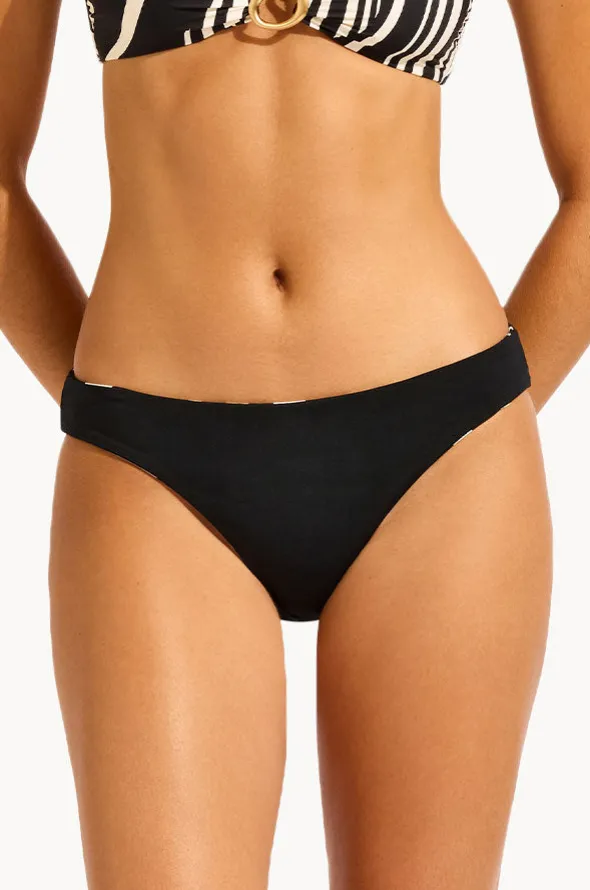 Seafolly Coastline Reversible Hipster in Black features a reversible design, hipster coverage, regular legline, medium coverage, and is available in sizes 8-14.