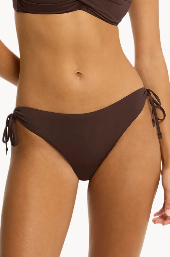 Sea Level Eco Essentials Tie Side Cheeky Pant in Cocoa features adjustable side ties, cheeky coverage, powermesh, regular legline, and is available in sizes 8-14.
