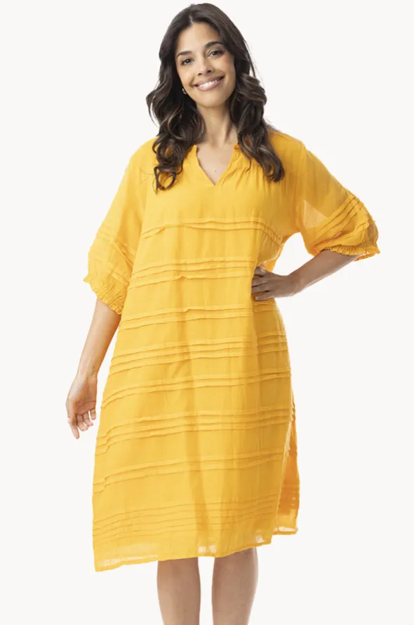 Orientique Essentials Cotton Gauze Pleated Dress in Saffron offers a round neckline, short sleeves, knee length, pleated detail, and is available in sizes 8-20.