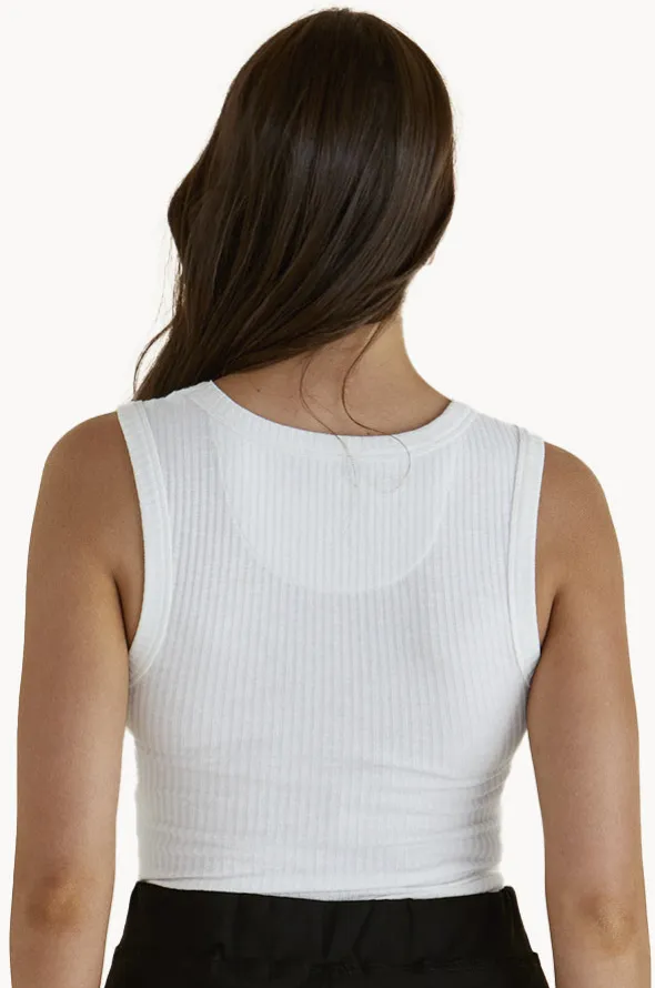 Betty Basics Francis Rib Tank in White features a round neckline, sleeveless, fitted, tank style top, ribbed fabric, and is available in sizes 8-16.