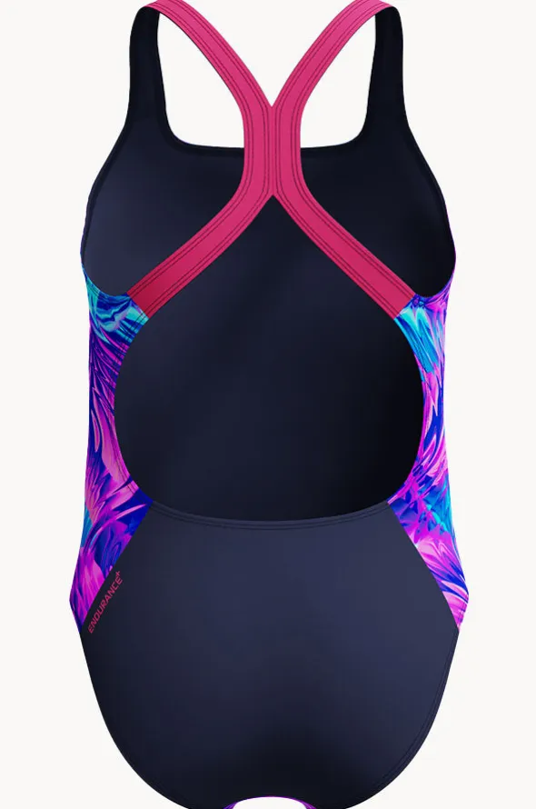 Speedo Girls Allover Print Powerback One Piece in Pink/Blue offers a chlorine resistant thread, powerback straps, sustaniable, and is available in sizes 8-14.