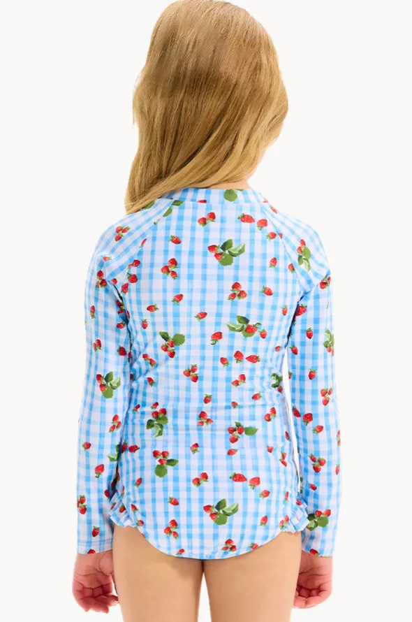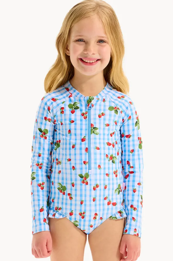 Seafolly Girls Beach Picnic Sunsuit in Blue/White features a round neckline, front zip, long sleeve, frill detail along legline, and is available in sizes 5-7.