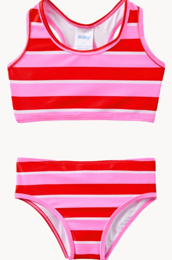 Milky Girls Candy Stripe Crop Set in Red/Pink features a crop style top, racerback straps, matching hipster pant, fully lined, and is available in sizes 3-7.