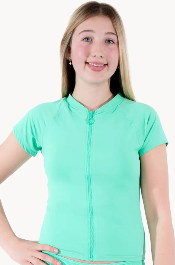 Base Swim Girls Cap Sleeve Rashie in Apple features a high, round neckline, full length front zipper, cap sleeves, and is available in sizes 8-16.