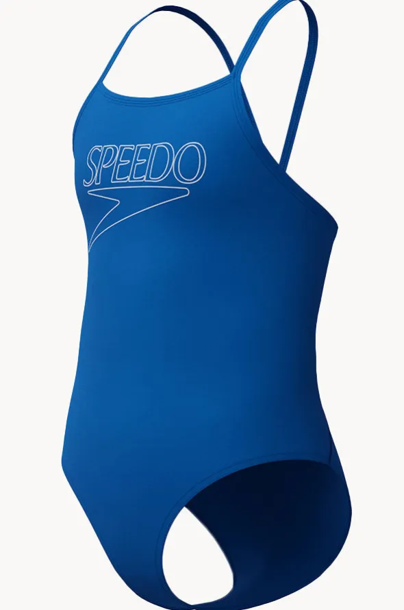 Speedo Girls Classic Logo One Piece in Sea features a round neckline, thin straps, front lined, chlorine resistant, and is available in sizes 10-16.
