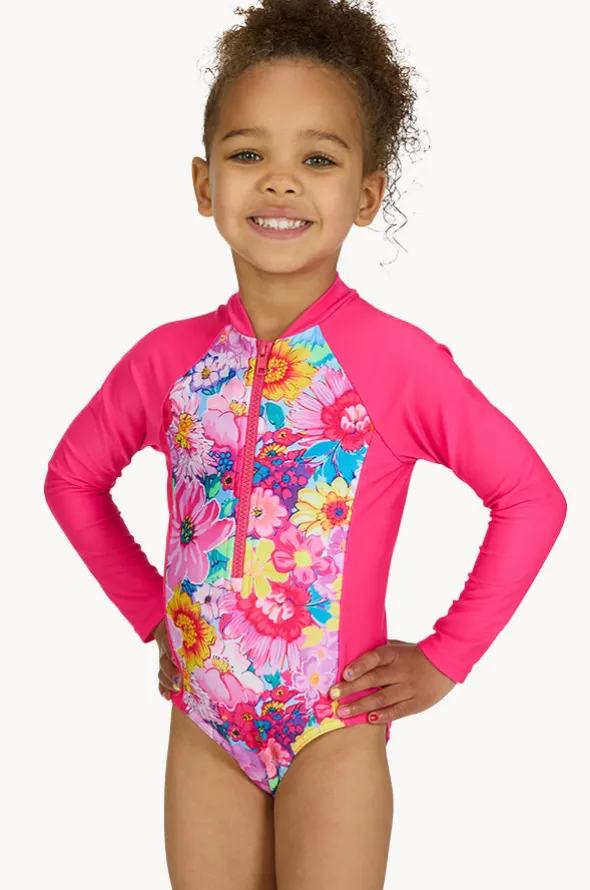 Zoggs Girls Eden Sunsuit in Pink/Multi features a front zip, long sleeves, UPF 50+ sun protection rating, quick drying fabric, and is available in sizes 4-6.