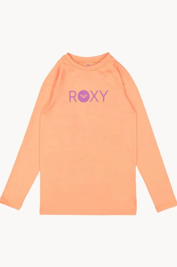 Roxy Girls Essential Long Sleeve Suntop in Coral features a round neckline, long sleeves, sun protection, sustainable fabric, and is available in sizes 8-16.