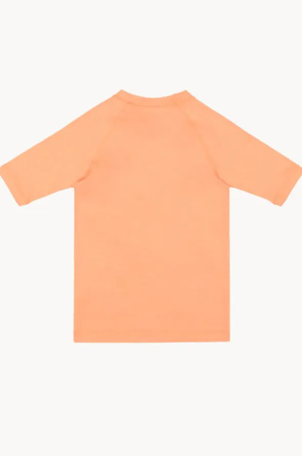 Roxy Girls Essential Short Sleeve Suntop in Coral features a round neckline, long sleeves, sun protection, sustainable fabric, and is available in sizes 4-7.
