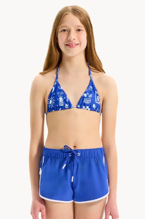 Seafolly Girls Essentials Boardshort in Marine features an elasticated waistband, drawcord, scallop hemline, contrast piping, and is available in sizes 8-16.