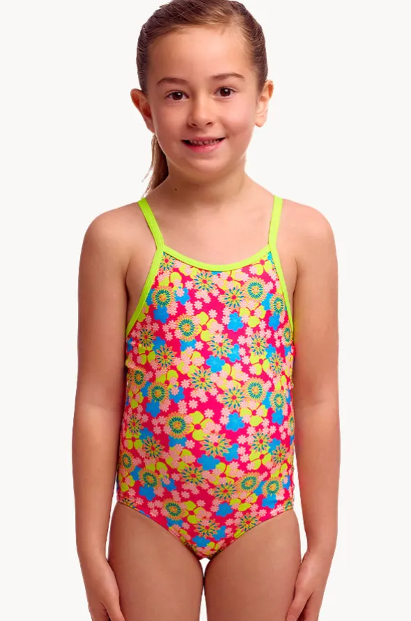 Funkita Girls Flow Blow One Piece in Multi features single bind straps, V-shaped back, quick drying, chlorine resistant, available in sizes 4-7.