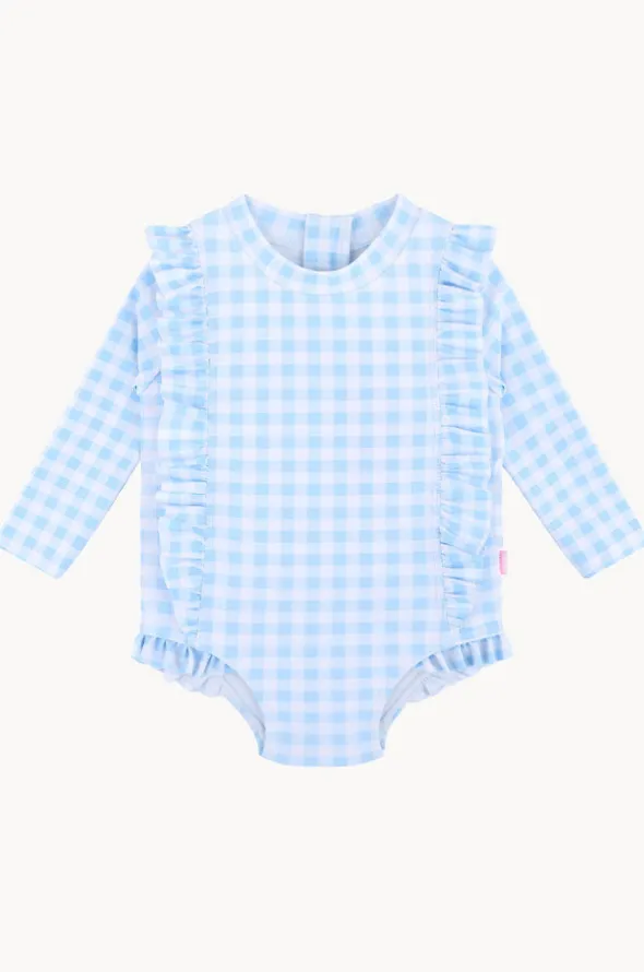 Seafolly Girls Gingham Frill Sunsuit in Blue features a round neckline, back zipper, long sleeves, UPF 50+ sun protection rating, and is fully lined.