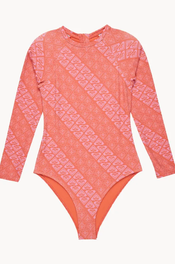 Roxy Girls Heart N Soul Sunsuit in Ember features a round neckline, back zipper, long sleeves and is made from sustainable fabric.
