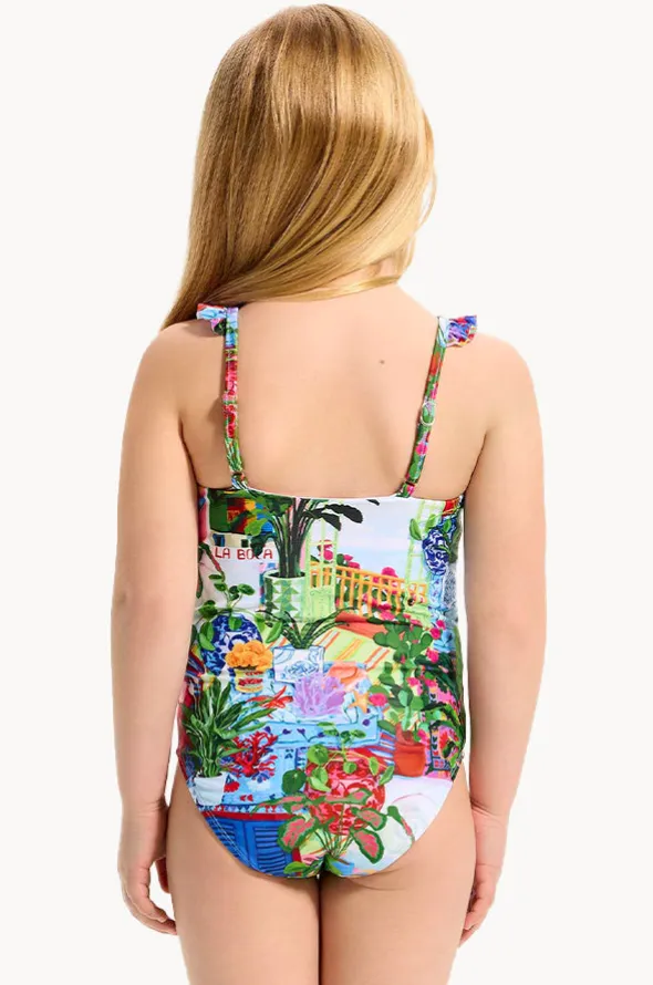 Seafolly Girls La Boca Frill One Piece in Multi features a round neckline, adjustable straps with frill detail, and is available in sizes 4-7.