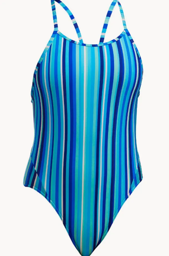 The Funkita Girls Lane Lines Diamond Back One Piece in Blue offers single bind straps, quick drying and chlorine resistant, available in sizes 8-14.
