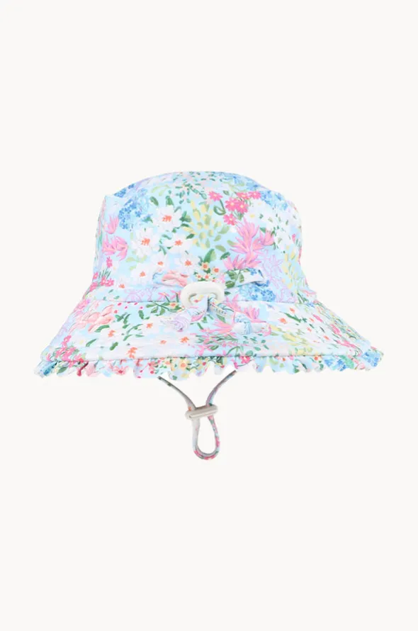 Minihaha Girls Lula Swim Hat in Blue/Multi features a bucket hat, wide brim with ruffle edge, chin strap, back toggle, and is available in sizes XS-XL.
