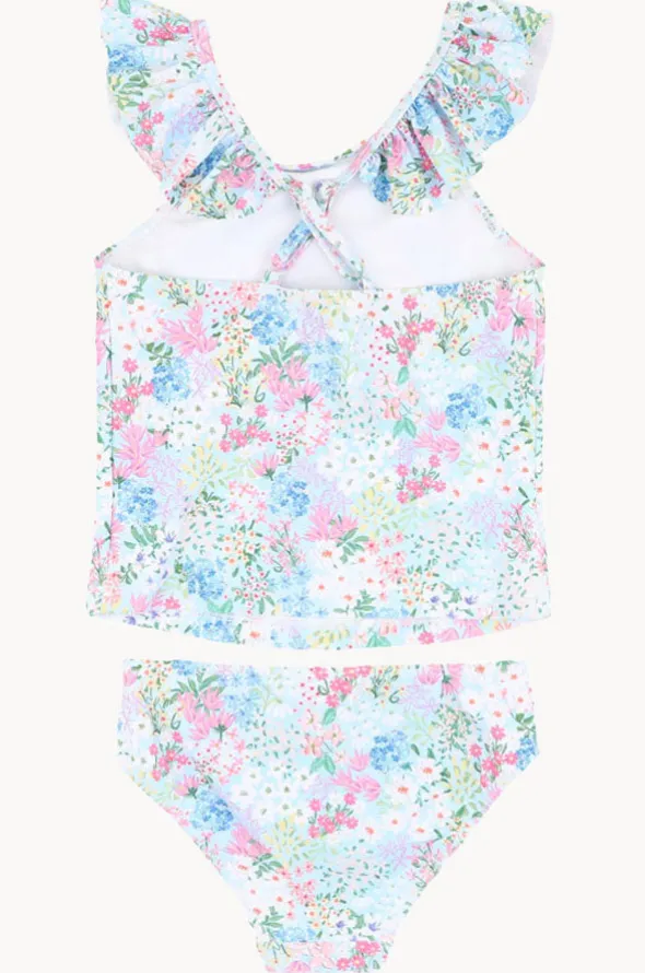 Minihaha Girls Lula Tankini Set in Blue/Multi features adjustable frill straps, sun protection, front lined, sustainable thread, and is available in sizes 4-7.