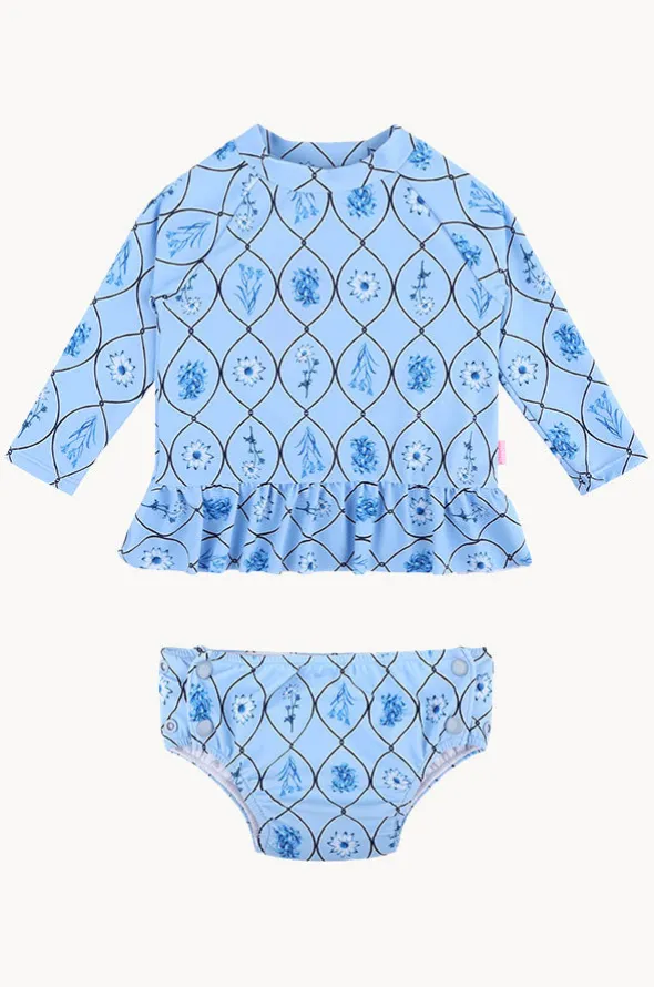 Seafolly Girls Marbella Suntop Set in Blue features a round neckline, long sleeves, peplum, coordinating swim nappy, and has a UPF 50+ sun protection rating.