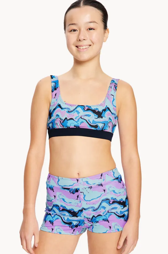 Modibodi Girls Marble Reversible Crop Set in Blue/Navy features a reversible crop top, mid rise boyleg pant, super absorbency, and is available in sizes 10-16.