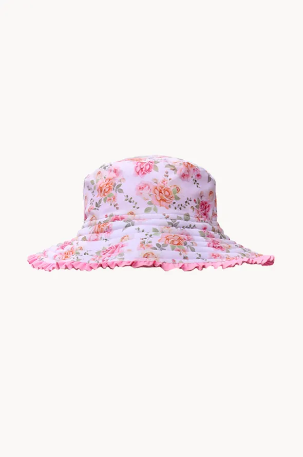 Salty Ink Girls Miss Rosie Reversible Sunhat in Pink features a bucket design, frill detail, reversible, UPF sun protection rating, is available in sizes XS-L.