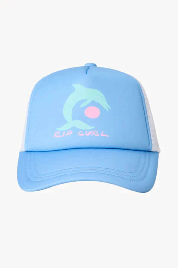 Rip Curl Girls Mixed Revival Trucker Cap in Sky Blue features a curved peak, mesh panels, adjustable back closure, and is available in O/S.