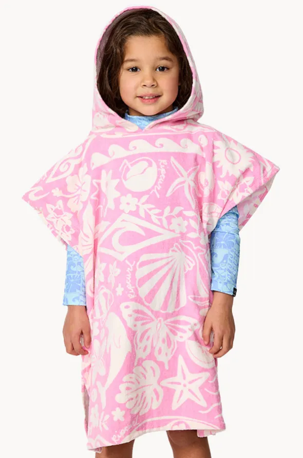 Rip Curl Girls Mixed Snap Hooded Towel in Pink features a pull-on design, snap side closures, hood, knee length, relaxed fit, and is available in O/S.