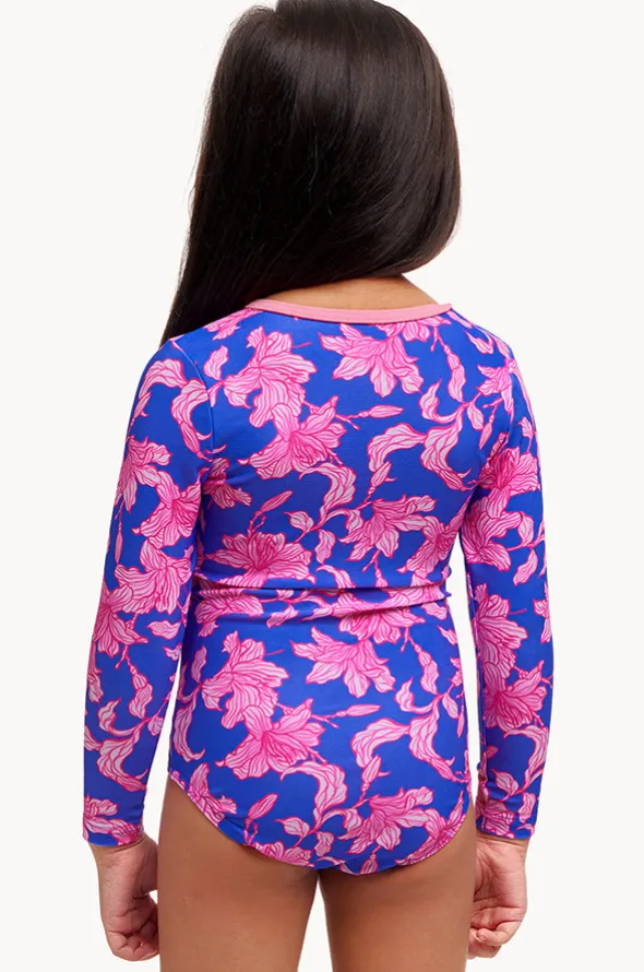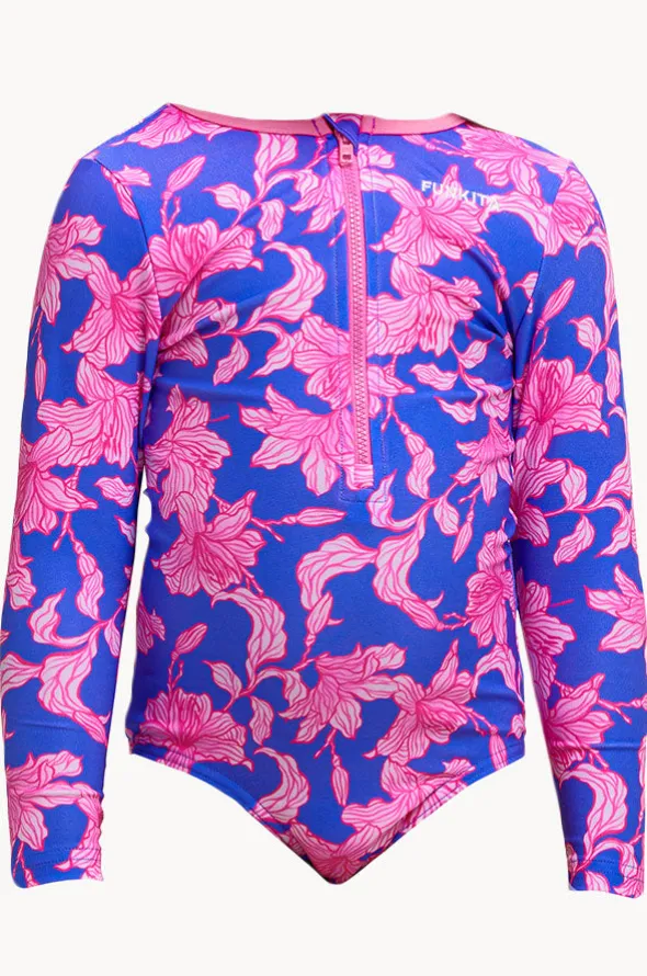 The Funkita Girls Perfect Petal Sunsuit in Pink/Purple features long sleeves, front zip, chlorine resistant fabric, sun protection, available in sizes 1-7.