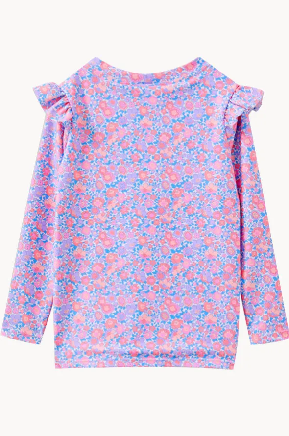 Milky Girls Pretty Posy Suntop in Pink/Blue features a round neckline, long sleeves, sun protection rating, frill detail, and is available in sizes 2-7.
