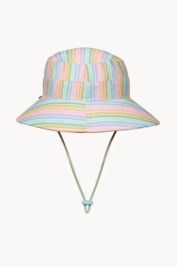 Bedhead Girls Rainbow Classic Bucket Sunhat in Multi features a anti-flop brim, chin strap with toggle, has a UPF rating of 50+, and is a water-friendly style.