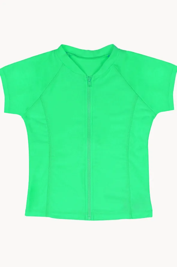 Salty Ink Girls Short Sleeve Zip Suntop in Kiwi features front full length zipper, short sleeves, sun protection rating, and is available in sizes 8-16.