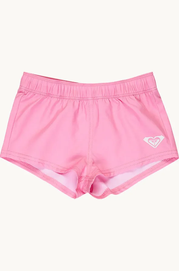 Roxy Girls Solid Basic Boardshort in Bon Bon features an elasticated waistband, short length, sustainable thread, and is available in sizes 5-7.