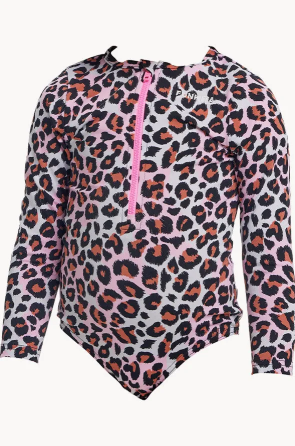 The Funkita Girls Some Zoo Life Sunsuit in Leopard features long sleeves, front zip, chlorine resistant fabric, UPF 50+ sun protection, available in sizes 1-7.