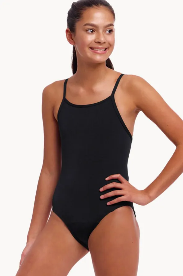 Funkita Girls Still Black Diamond Secure One Piece in Black features light flow period protection, chlorine resistant thread, and is available in sizes 10-14.