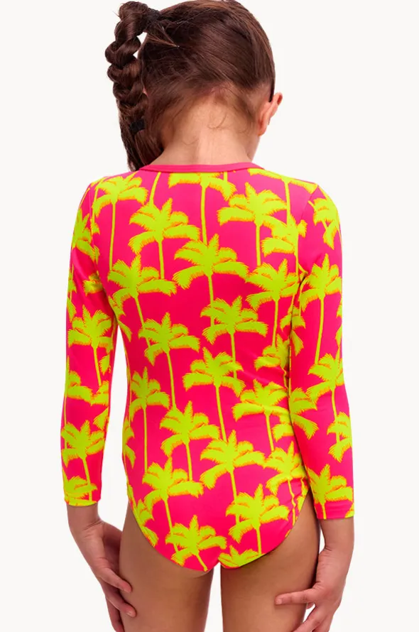 Funkita Girls Sweet Coconuts Sunsuit in Pink/Yellow features front zip, UPF 50+ sun protection, long sleeves, chlorine resistant, and is available in sizes 3-7.