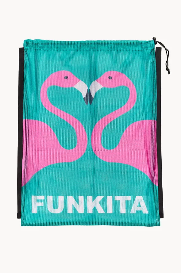 Funkita Go Flamingo Mesh Gear Bag in Teal/Pink features dual shoulder straps, drawstring opening, durable when wet, and is made from a mesh fabric.