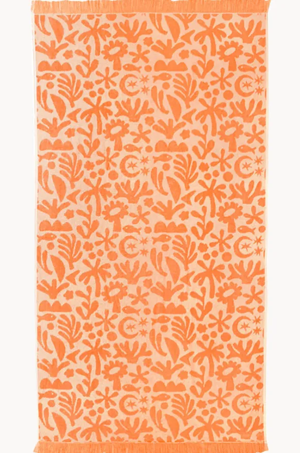 Bambury Holiday Beach Towel in Peach features an absorbent fabric, quick drying, fringing, and is perfect for days at the beach or pool.