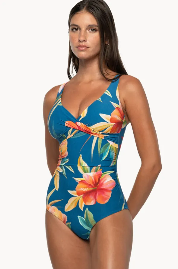 Nip Tuck Hula Hula Louise One Piece in Blue features a cross front neckline, soft cups, adjustable straps, powermesh, and is best suited to C-DD cup sizes.