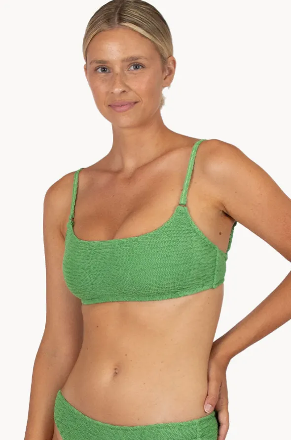 The Baku Ibiza B/D Square Neck Bralette in Moss features soft removable cups for shaping, adjustable tie back, textured fabric, and designed in sizes 8-16.