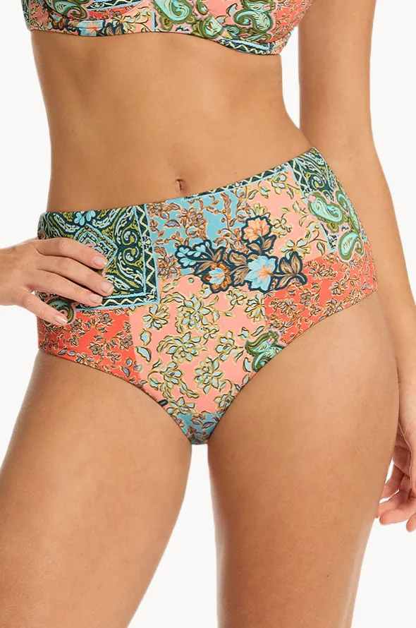 Sea Level Java High Waist Pant in Coral features a high rise waist, regular legline, medium coverage, powermesh, and is available in sizes 8-18.