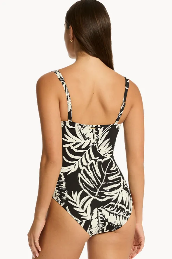 Sea Level Jungle Book Twist Front One Piece in Black features soft cups, adjustable straps, front ruching, powermesh, and is best suited to B-DD cup sizes.