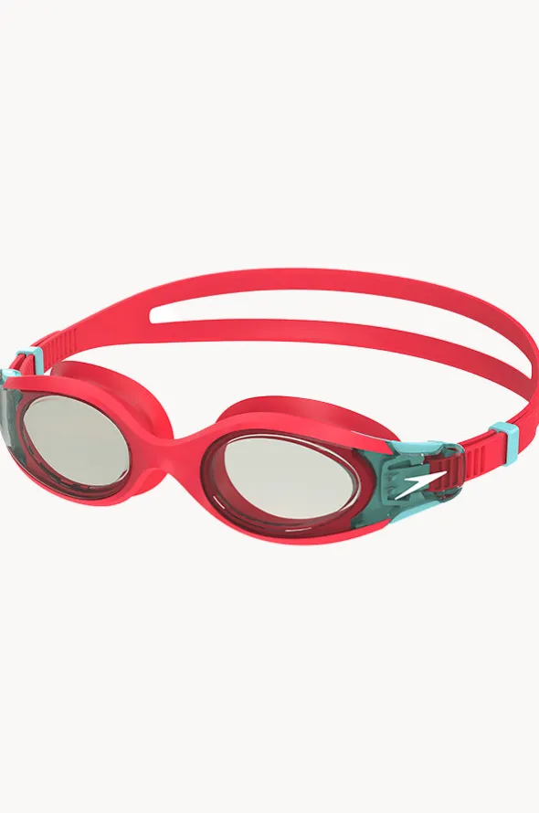 Speedo Junior Hydrosity 2.0 Goggle in Red/Blue features an adjustable strap, UV protection, and has an anti-fog coating.