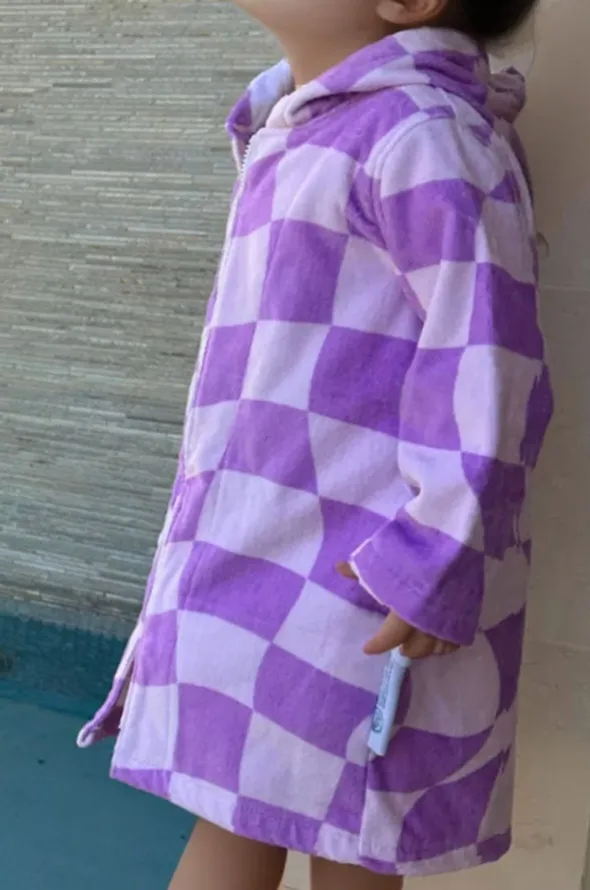 Back Beach Co Kids Ocean Drifter Hooded Towelling Robe in Purple made with 100% cotton features a full length zip and hood and is suitable for ages 5-7.