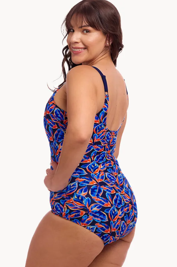 Funkita Leaf Blower Scoop Neck One Piece in Navy/Orange features soft cups, shelf bra, mastectomy pockets, chlorine resistant, best suited to B-DD cup sizes.
