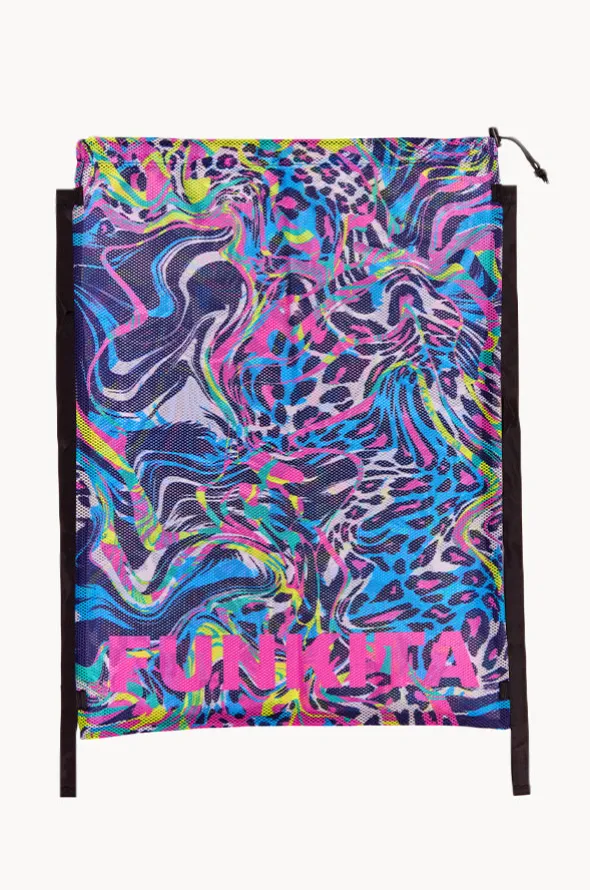 Funkita Lolly Leopard Mesh Gear Bag in Multi features dual shoulder straps, drawstring opening, durable when wet, mesh fabrication.