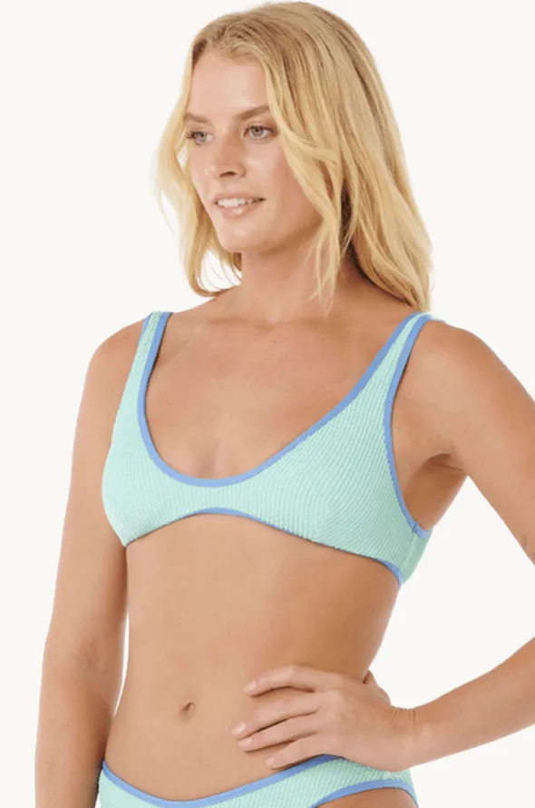 Rip Curl Luxe Surf Bralette in Aqua features fixed straps, removable cups, contrast piping, textured rib fabric, sustainable, is best suited to A-C cup sizes.
