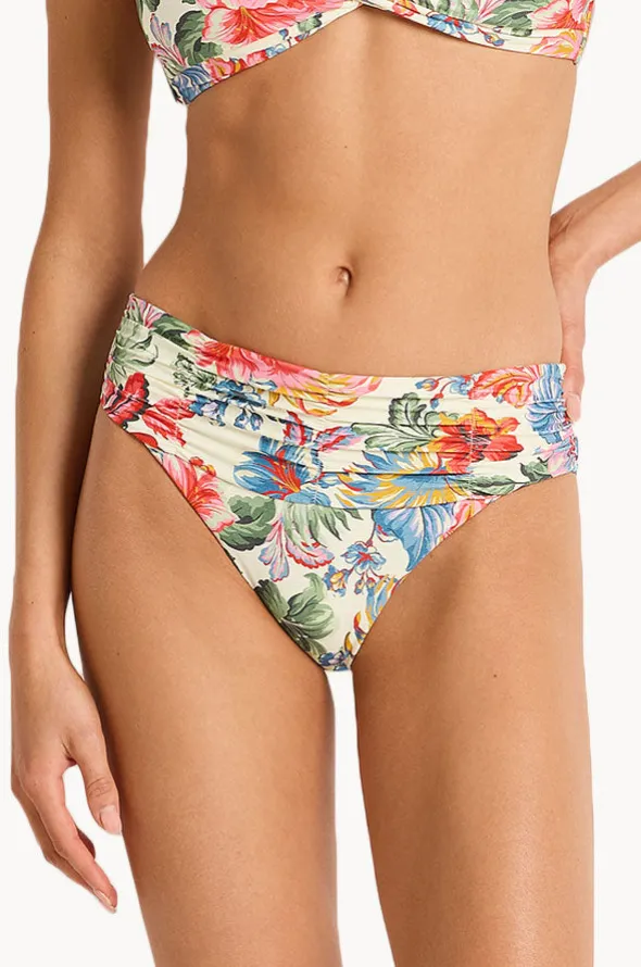 Monte & Lou Marisol Mid Rise Ruched Pant in White/Multi features a mid rise waist, front ruching, medium coverage, and is made from sustainable fabric.