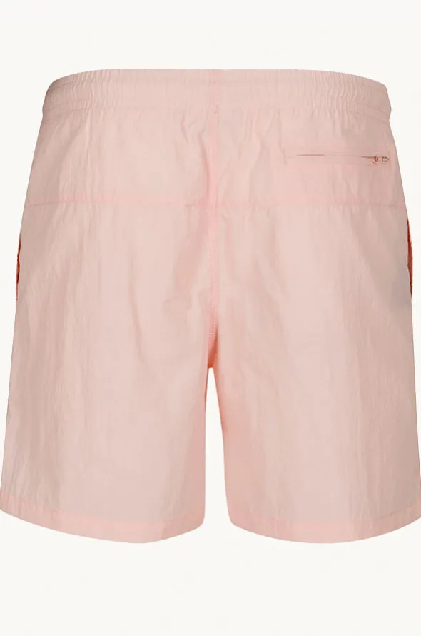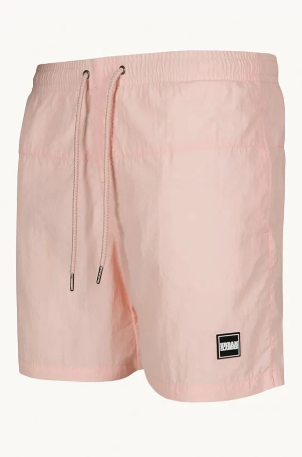 Urban Classics Mens Block Swim Short in Pink features a 5″ inseam, quick-dry nylon, mesh lining, drawstring waist & side pockets.